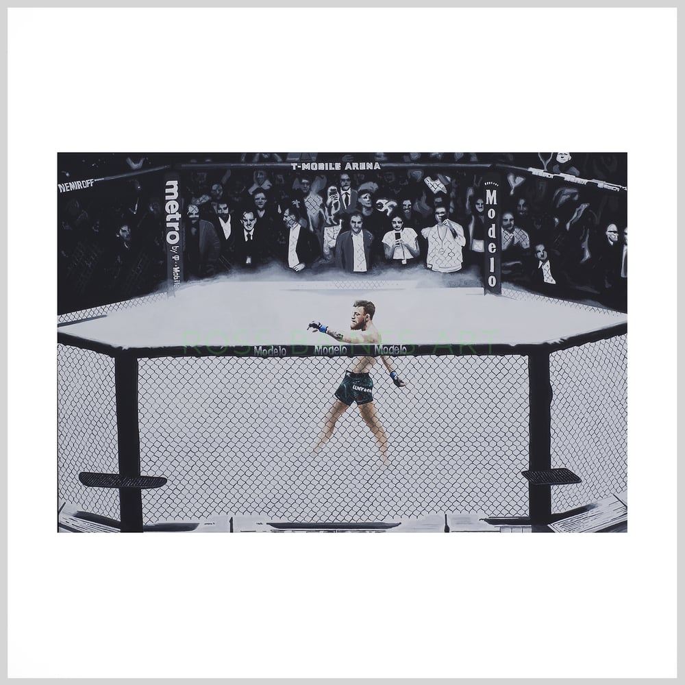 Luxury print editions of an original Ross Baines painting featuring Conor McGregor making his famous truly memorable cagewalk at UFC 246.