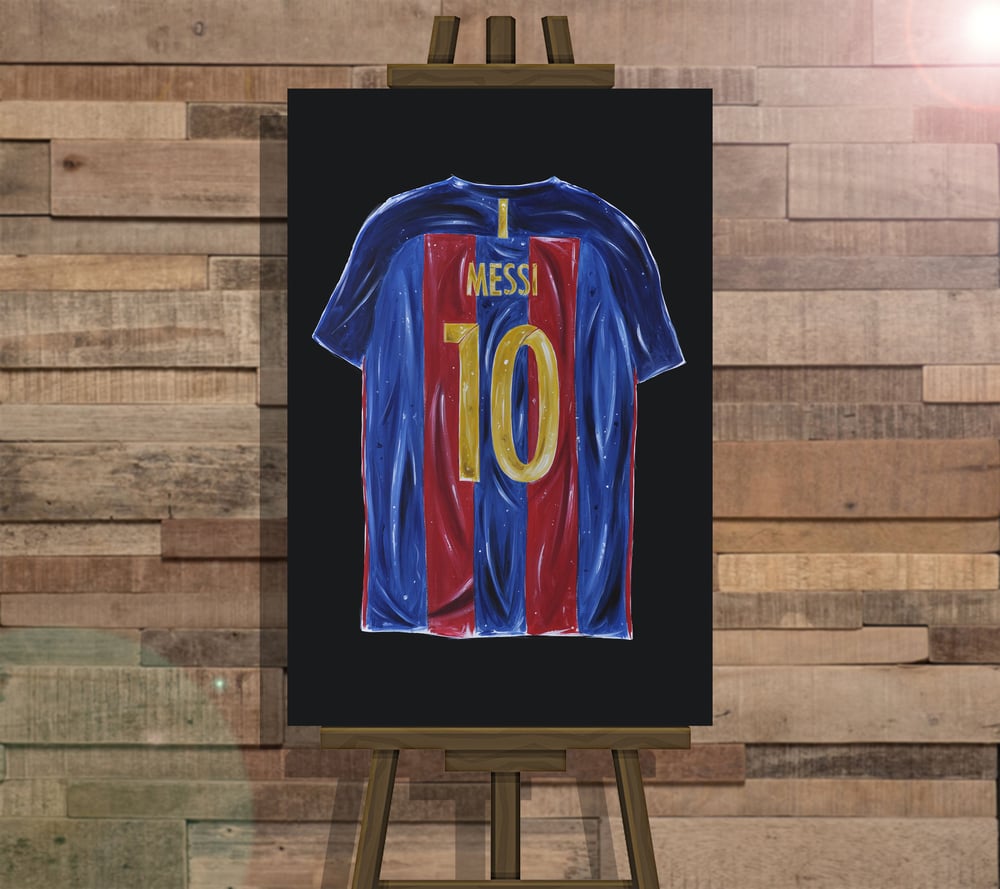 Original 3x2ft acrylic painting from Ross Baines featuring Messi's number 10 shirt.