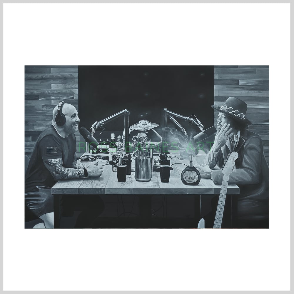 Luxury print editions of an original Ross Baines painting featuring the mighty Joe Rogan with a rather special guest… Jimi Hendrix.