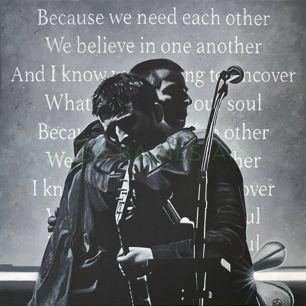 Luxury print editions of an original Ross Baines painting featuring the mighty Noel & Liam Gallagher in a brotherly embrace during the second night of their ground breaking reunion tour, against the backdrop of the lyrics of one of their finest songs, Acquiesce.